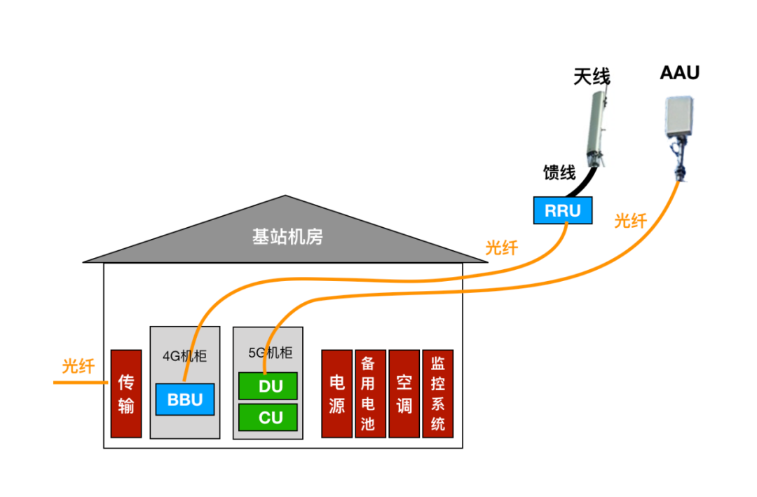 从4G到5G,基站架构上最大的变化是,4G是BBU(基带单元)放在基站机房,通过光纤和RRU(射频拉远单元)连接(也就是所谓的前传),RRU靠近天线,通过馈线相连。5G的结构不再是BBU和RRU,其中原来BBU的功能分为CU(中央单元)和DU(分布单元),他们还是放在基站机房,再通过光纤与AAU(有源天线单元)直接连接(5G前传)。5G里面的AAU相当于4G里面的RRU和无源天线。